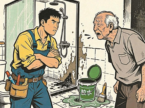 2022年的一天,家住上海的王大爷发现家中卫生间的淋浴房墙面漏水,于是在网上联系了一家自称用“进口胶水”防水补漏的商户,预约上门维修。